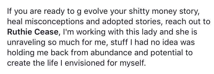 "In 2018, I bought Ruthie's DYSMS because I wanted to up my money mindset. I was really struggling financially and I wanted to heal my money shit so that I could receive more. The first time we talked on the phone, Ruthie blew me away with the way she saw me. She held compassion and space for me, but also called me out on patterns and beliefs I had never been able to identify. I quickly jumped into her private coaching program and learned that my financial struggles were so much more about money. Money was the symptom of something much deeper that needed to be healed. While working with Ruthie, I was able to increase and grow my business, tripling my sales within a month or two of working together, but also gaining a deeper sense of who I am. Ruthie taught me the importance of forgiveness, healing, and love in my life and I know that it was that work that I did within my relationships with others, my past and myself that healed the root of my money mindset and opened me up to receive more. Ruthie and her work changed my life and I am forever grateful for her."